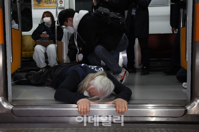 #2022년 4월 21일 박경석 전국장애인차별철폐연대(전장연) 공동대표와 회원들이 서울 종로구 지하철3호선 경복궁역에서 '출근길 지하철 타기' 시위를 하고 있다.